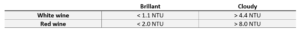 1. BRILLIANCE in wine is evaluated by measuring turbidity which is expressed by the nephelometric turbidity unit (NTU). The above table summarizes the correlation between turbidity and the visual appearance of wines. After filtration, turbidity must be less than at least 2 NTU.